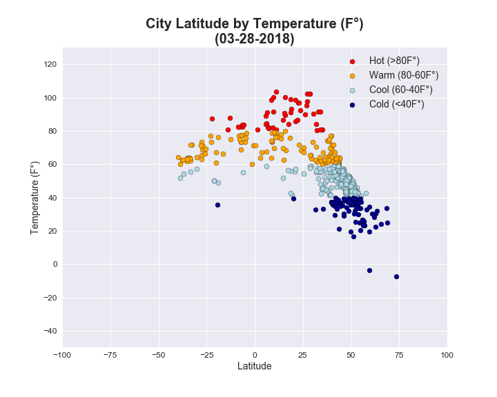 This chart plots each city's latitude compared to its temperature. The x-axis represents the latitude for each city, with 0 being the equator. Positive numbers go farther north on a map and negative numbers go farther south. The y-axis represents the temperature in degrees Fahrenheit. I grouped the temperature readings into four categories: cold (<40°), cool (40°-60°), warm (60°-80°) and hot (>80°).